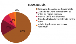 CIUDAD DE MÉXICO, 25 de julio (Almomento MX/Intelicast).- Entre las noticias principales que se publican en los medios de comunicación, de acuerdo con el monitoreo informativo realizado por Intelicast, se encuentra que luego de que los alcaldes de Pungarabato, Guerrero, Ambrosio Soto Duarte, y de San Juan Chamula, Chiapas Domingo López González, fueron privados de la vida por personas armadas, la Procuraduría General de la República (PGR), dio a conocer que atrajo la investigación de los hechos en los dos municipios.