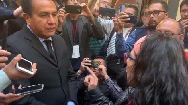 Todo comenzó cuando un reportero, Marco Antonio Olvera, del diario digital Bajo Palabra, usó el micrófono para hacer una pregunta en la que desacreditó el movimiento feminista del 9 de marzo. Luego de formulada su pregunta, los informadores –sobre todo las reporteras- lo abuchearon: “¡¡Buuuh…!!” le gritaron.