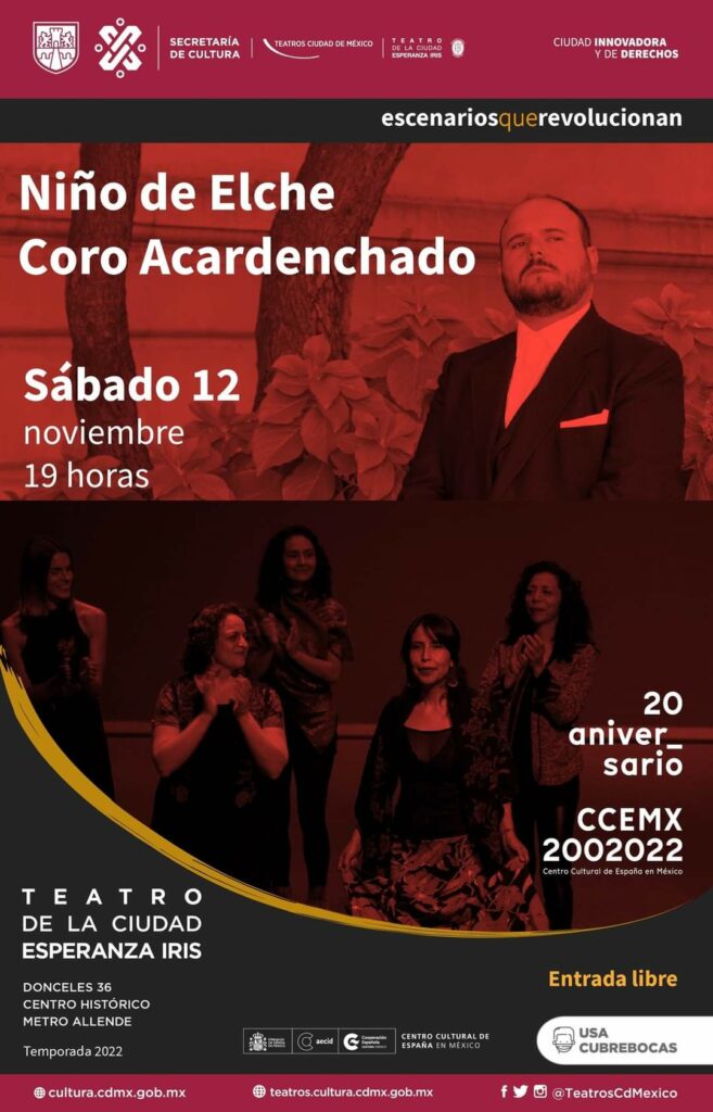 Para festejar su 20 aniversario, este 12 de noviembre, a las 19:00 hrs., en el Teatro de la Ciudad Esperanza Iris, se presentará el artista multidisciplinario Niño de Elche, que conjunta el flamenco con el rock, performance y la danza contemporánea, y el Coro Acardenchado, cuya propuesta reivindica el canto cardenche en el panorama musical contemporáneo.