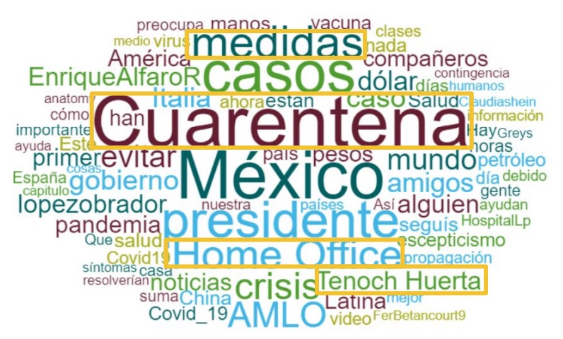 Por otra parte, el estudio revelo que términos como “Cuarentena” y “México” son de los más utilizados en los últimos días. También destaca “Home Office”, luego de que distintas instituciones privadas y públicas implementaron esa modalidad de trabajo como una medida de prevención.