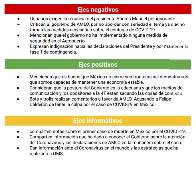 Mientras que solo el 7 por ciento de las publicaciones eran positivas hacia el Gobierno federal, en donde se destacaba la estabilidad económica del país y la planificación de las medidas de sanitarias de la Secretaría de Salud federal en los aeropuertos del país.