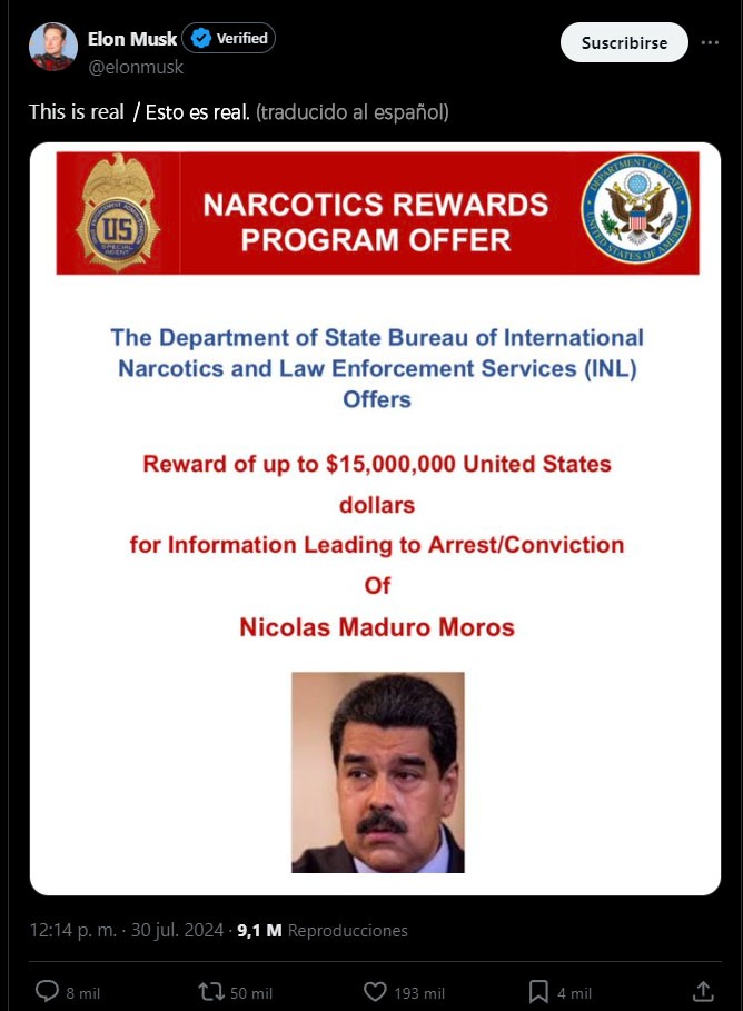 Debido a esto, en 2020, el Departamento de Estado de los EEUU, publicó una ficha de recompensa de $15 millones de dólares por información que conduzca al arresto y/o condena de Maduro,