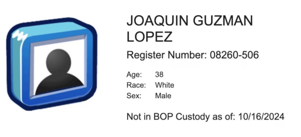 Se ha reportado que Joaquín Guzmán López, hijo de Joaquín «El Chapo» Guzmán, podría haber salido de prisión en Estados Unidos, dado que su nombre no se encuentra en el registro de la Agencia Federal de Prisiones (BOP, por sus siglas en inglés).