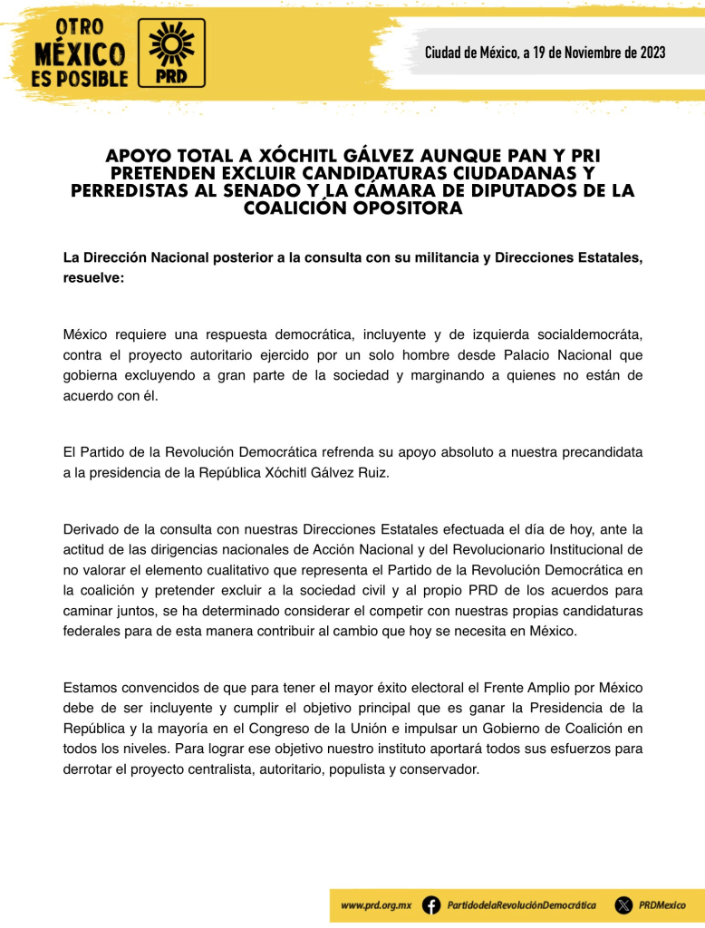“No valorar el elemento cualitativo que representa el PRD en la coalición y pretender excluir a la sociedad civil y al propio PRD de los acuerdos para caminar juntos”, expresó el PRD en un comunicado.