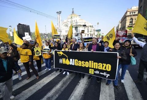 CIUDAD DE MÉXICO, 9 de enero (AlMomentoMX).- Militantes y dirigentes del PRD protestaron en contra del alza en los precios de los combustibles frente al Palacio de Bellas Artes.