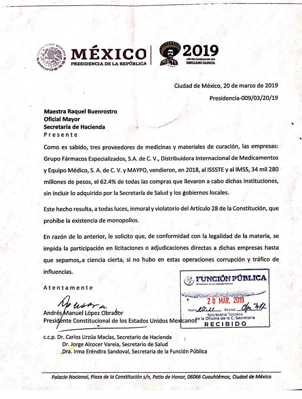 CIUDAD DE MÉXICO, 8 de abril (AlMomentoMX).— El presidente Andrés Manuel López Obrador envió un oficio a Raquel Buenrostro, oficial Mayor de la Secretaría de Hacienda, para que se impida participar en licitaciones o adjudicaciones directas a tres empresas proveedoras de medicinas y materiales de curación que concentraron el 62.4 por ciento de las ventas a instituciones de salud pública en 2018.