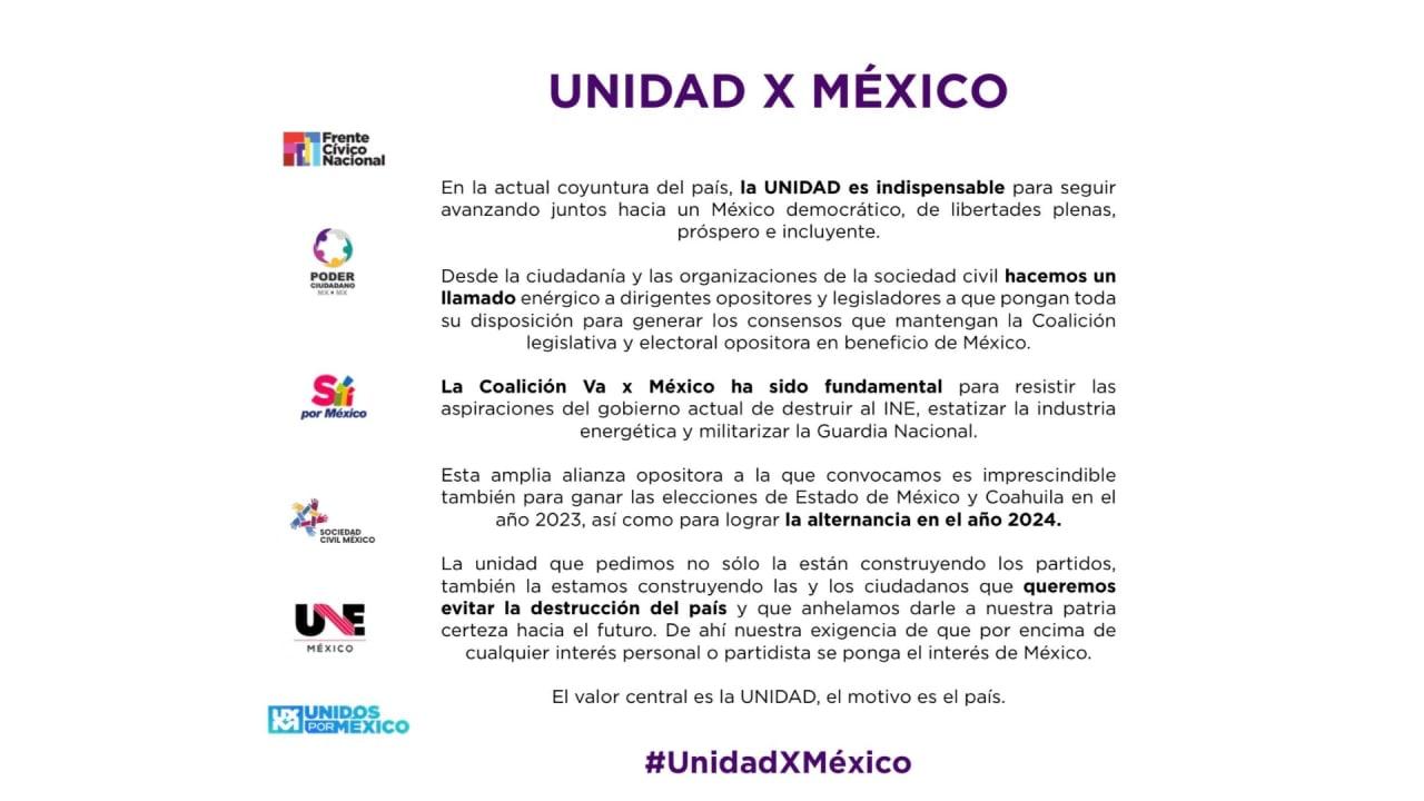 “La unidad que pedimos no sólo la están construyendo los partidos, también la estamos construyendo las y los ciudadanos que queremos evitar la destrucción del país y que anhelamos darle a nuestra patria certeza hacia el futuro”, se lee en el documento difundido.
