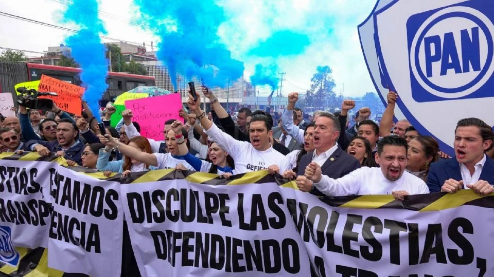 Legisladores, militantes y simpatizantes del Partido Acción Nacional (PAN) llevaron a cabo una protesta en la avenida Insurgentes Sur este miércoles, bloqueando el tránsito a la altura de Llanura, en la alcaldía Álvaro Obregón, Ciudad de México.
