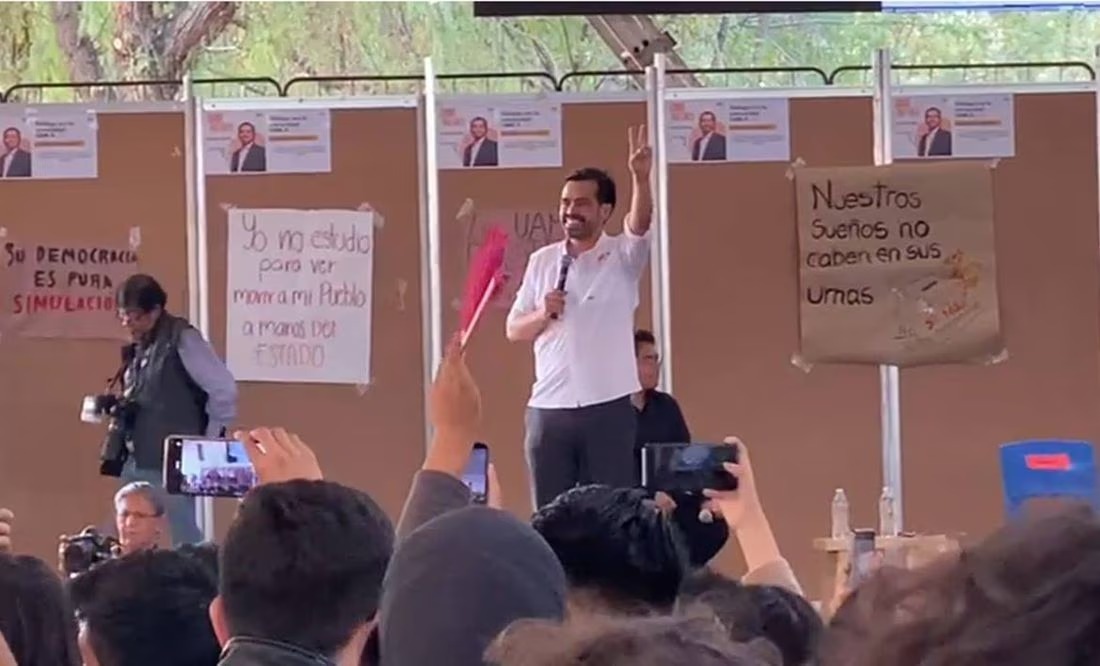 Al llegar al escenario, estudiantes bloquearon temporalmente el inicio del evento e incluso desconectaron la pantalla donde se proyectaba un promocional del candidato. A pesar de las protestas, Álvarez Máynez decidió continuar con su discurso, enfrentando tanto aplausos de apoyo como rechiflas.