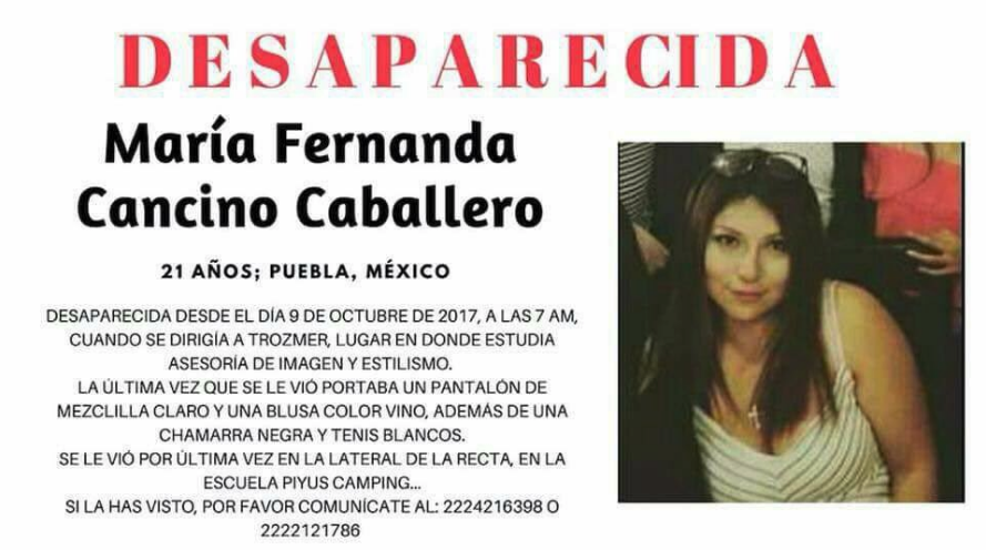 La familia de María Fernanda acudió desde el martes 10 de octubre a la Fiscalía General del Estado para interponer una denuncia por su desaparición pues, la joven de 21 años que fue vista por última vez cuando caminaba sobre la recta a Cholula, a la altura de Momoxpan, nunca llegó a su centro de estudios.