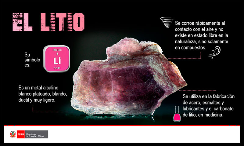 Descripción El litio es un elemento químico de símbolo Li y número atómico 3. En la tabla periódica, se encuentra en el grupo 1, entre los elementos alcalinos. En su forma pura, es un metal blando, de color blanco plata, que se oxida rápidamente en aire o agua. Wikipedia