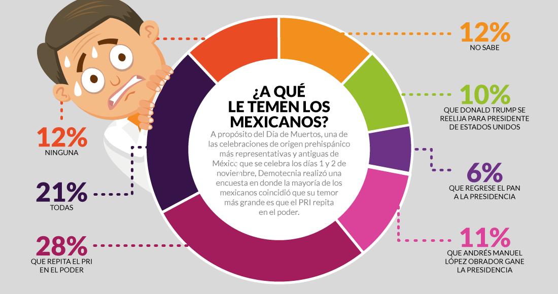 CIUDAD DE MÉXICO, 1 de noviembre (AlMomentoMX).-  ¿Qué le da más miedo a los mexicanos? De acuerdo con una encuesta De las Heras Demotecnia, a propósito del Día de Muertos, el mayor temor de los encuestados es que el Partido Revolucionario Institucional (PRI) repita en el poder.