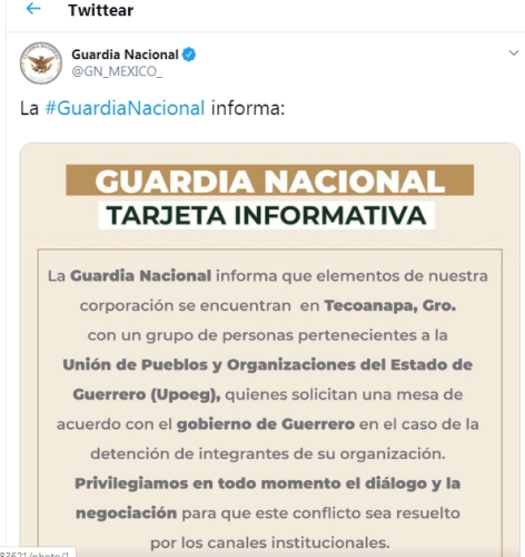 De acuerdo con la Guardia Nacional, la UPOEG solicitó una mesa de acuerdo con el gobierno tras la detención de integrantes de la agrupación, por lo que resaltó que en esa corporación se privilegia el “diálogo y la negociación para que este conflicto sea resuelto por canales institucionales”.
