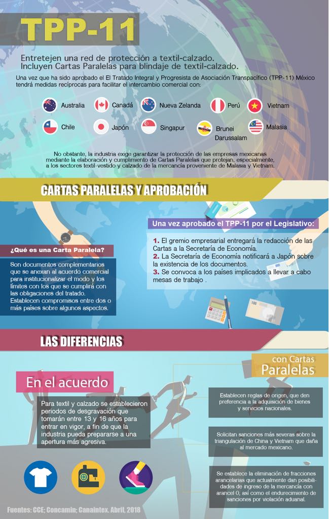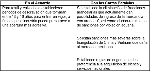 Las cámaras Textil, del Vestido y del Calzado, demandan a la Secretaría de Economía el cumplimiento de lo dispuesto en las cartas paralelas contenidas en el Tratado, ratificadas también, y que respaldan a estos sectores de prácticas de comercio desleal por parte de naciones asiáticas como Vietnam y Malasia.