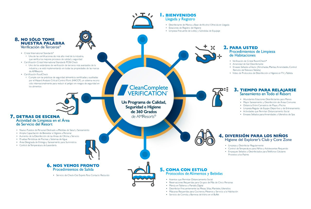 También a través de un comunicado, la empresa detalló su programa “Clean Complete Verification” (verificación completa de limpieza), con lo que elevan sus estándares de calidad y limpieza en sus 58 hoteles en México y otros países de la región. El programa incluye protocolos de prevención de contagio, certificación de alimentos, filtros para revisar la temperatura de personal y huéspedes, limpieza de todas las áreas, medidas de distanciamiento social, entre otros.
