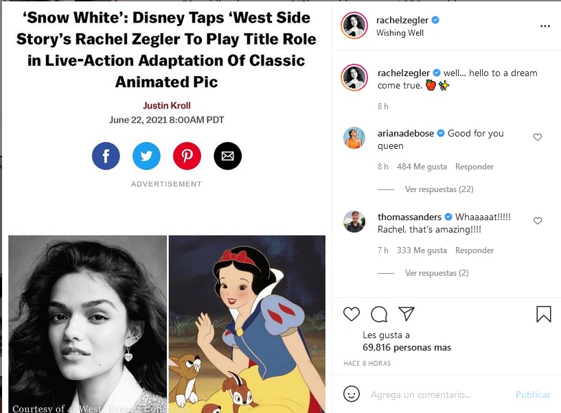 Por su parte, la actriz compartió en sus redes sociales la noticia de que será la próxima Blancanieves, con la siguiente frase: “hola a un sueño hecho realidad”.