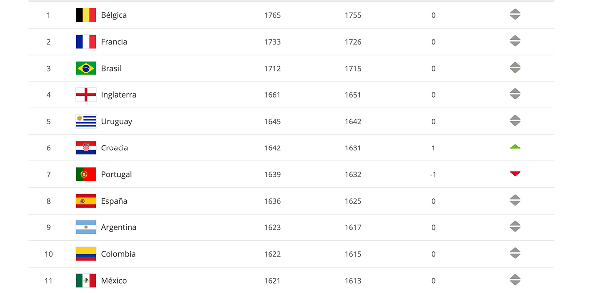 Por su parte, Bélgica se mantiene como líder de la clasificación, por delante de Francia, actual campeón mundial. Mientras que Brasil, Inglaterra y Uruguay se mantuvieron sin cambios del sitio tercero al quinto.