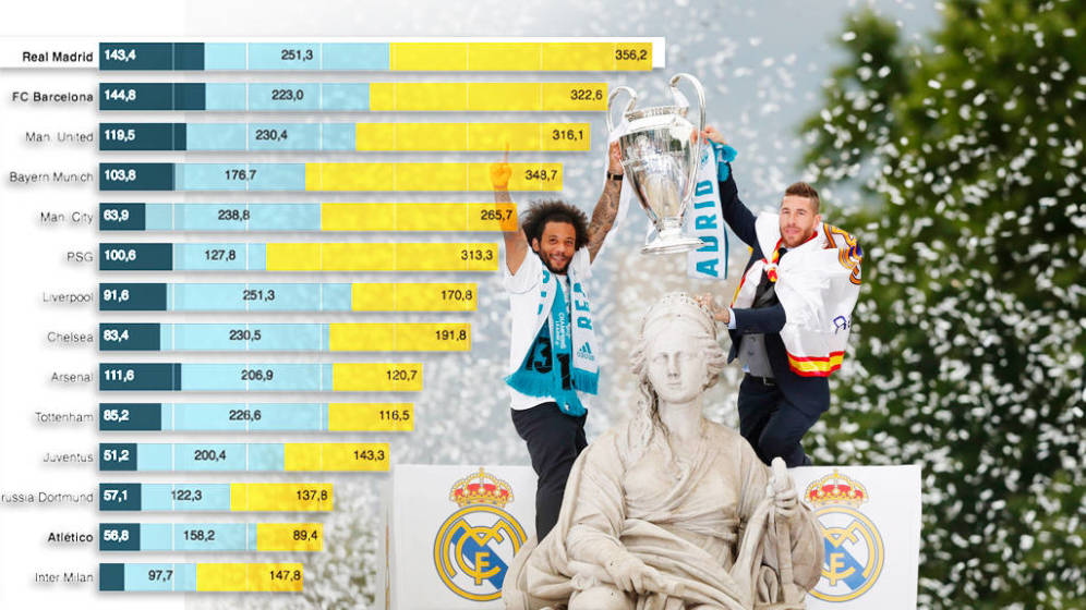 El análisis de Deloitte tiene en cuenta los ingresos por derechos de televisión —que supone un 43 por ciento del total—, los ingresos comerciales y los ingresos por los días de partido —que integran entradas y productos vendidos por el club durante estos—.