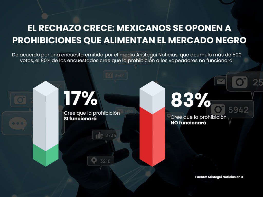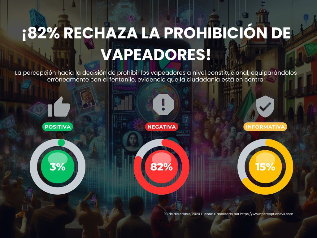 De acuerdo con el análisis de conversación sociodigital “Prohibición constitucional de vapeadores”, elaborado por MW Group, la percepción digital sobre la prohibición fue 82% negativa y según una encuesta en X realizada por Alfredo Romo de 88.9, el 62% de los que respondieron consideró que la prohibición es exagerada y 83% cree que la prohibición no funcionará.