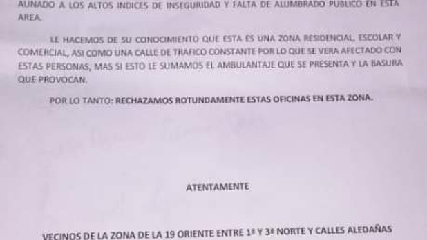 Los vecinos dirigieron una carta a la titular de la oficina del INM en Tapachula, Carmen Yadira de los Santos Robledo, argumentando que los extranjeros establecen sus casas de campañas en las banquetas y las calles y realizan sus necesidades básicas al aire libre por lo que puede ser un foco de infección para la salud de los vecinos.