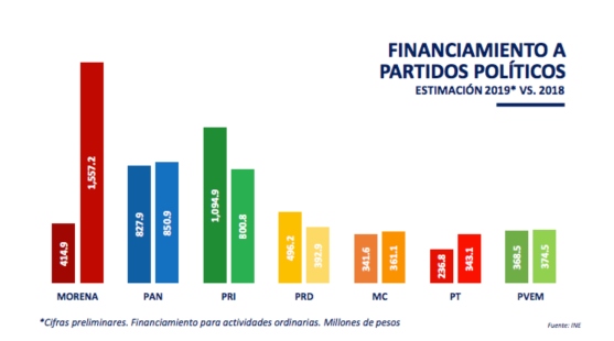 Índice Flamígero: Delfina Gómez y Ricardo Monreal, senadores de Morena, presentaron a finales del último septiembre una iniciativa en el Senado de la República en la que se propone una modificación constitucional para reducir a la mitad el presupuesto que se destine a partir del 2019 a los partidos políticos. A finales de diciembre, por su parte, Andrés Manuel López Obrador pidió a los partidos políticos renunciar, de manera voluntaria, a la mitad de las prerrogativas que recibirán en 2019, “para que la austeridad sea completa”. Nada de eso ha prosperado. Según el Reporte Electoral 2018 de Integralia, Morena recibió 414.9 millones de pesos en 2018 y, de acuerdo con su cálculo, para 2019 obtendrá 1,557.2 millones de pesos, es decir, 3.7 veces más. El PRI obtuvo el año pasado 1,094.9 millones que caerán a 800 en 2019; mientras el PRD tuvo 496.2 millones en 2018 y para 2019 recibirá 392.9 millones.