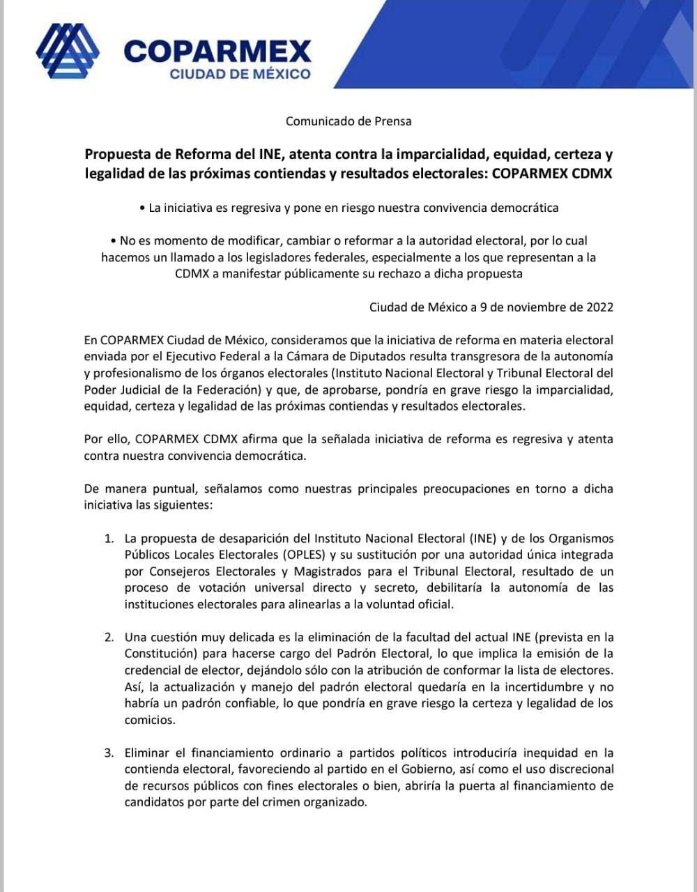 La iniciativa de reforma en materia electoral enviada por el Ejecutivo Federal a la Cámara de Diputados resulta transgresora de la autonomía y profesionalismo de los órganos electorales INE y TEPJF, consideró la Coparmex de la CDMX.