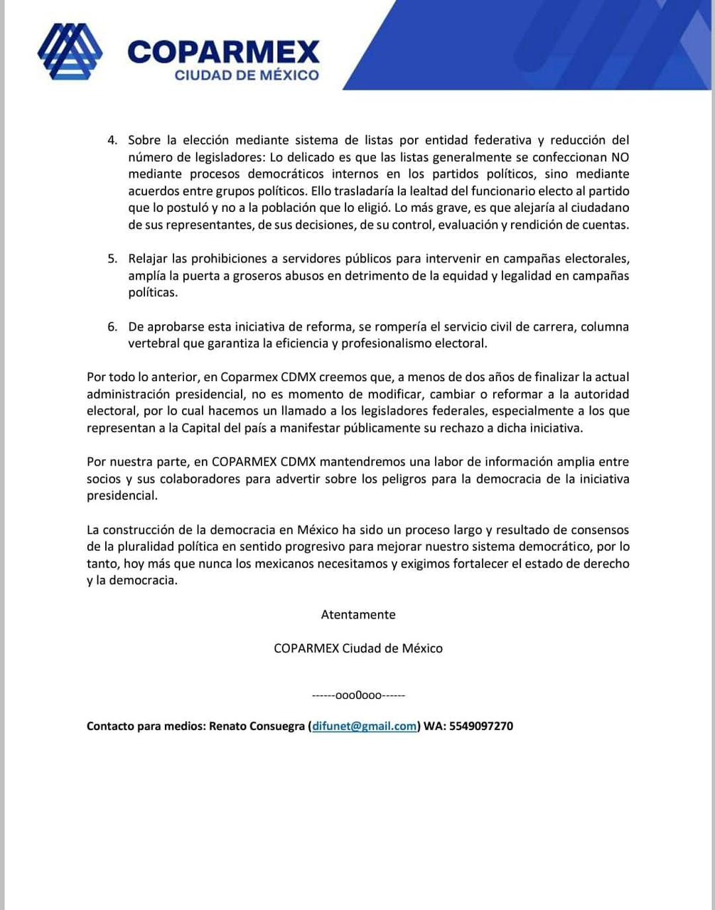 La confederación patronal lamentó también que, de aprobarse la reforma, se cortaría de tajo con el servicio civil de carrera, columna vertebral que garantiza la eficiencia y profesionalismo electoral.