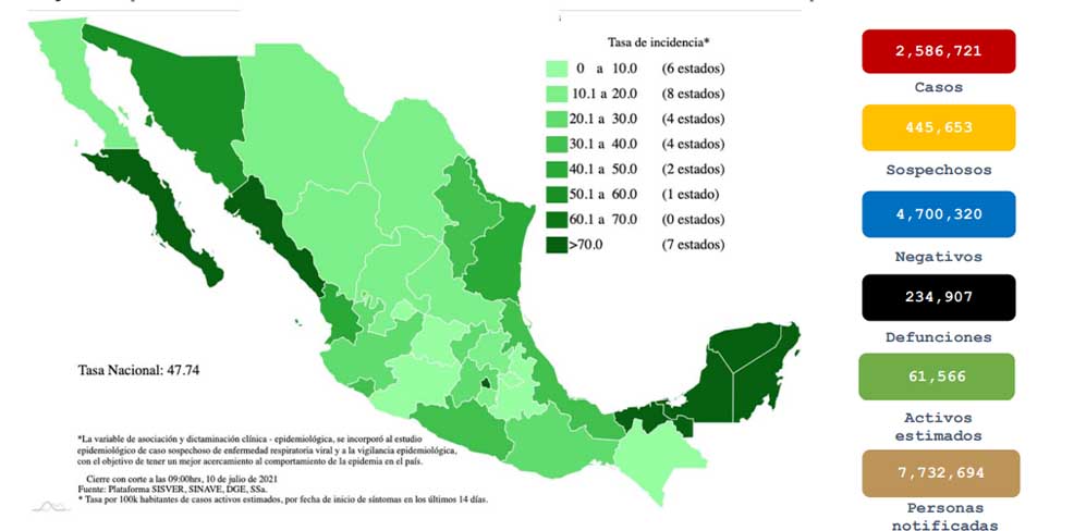 Ciudad De México.- El día de ayer, diez de julio, la Secretaría de Salud confirmó 234 mil 907 defunciones a nivel nacional por Covid-19. Así mismo, en el informe técnico compartido diariamente a través de la página del Gobierno de México, se indicó que en las últimas 24 horas (entre el 9 y 10 de julio) se reportaron 458 mil 355 casos nuevos y 8 mil 516 nuevas muertes nivel global.