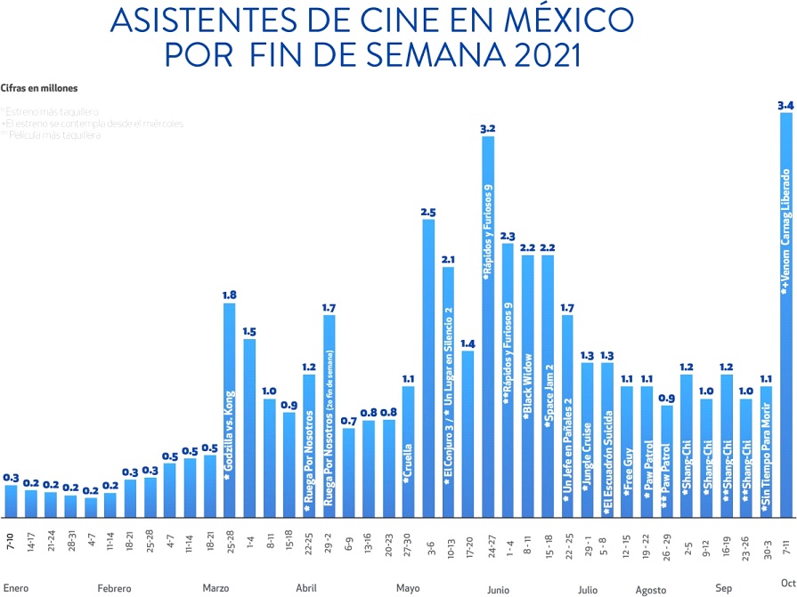 Estos resultados fueron consecuencia, principalmente, de una cartelera variada y atractiva que incluyó el esperado estreno “Venom: Carnage liberado”, mismo que logró la asistencia de 2.9 millones de personas. Venom complementa una variada oferta de películas como “Sin tiempo para morir”, “Coda”, “Shang-Chi” o “La Casa Oscura”.