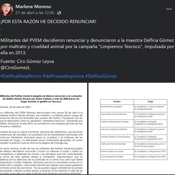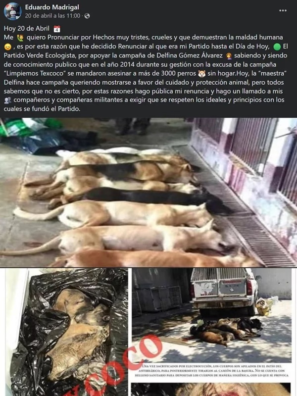 “Hoy 20 de Abril. Me quiero Pronunciar por hechos muy tristes, crueles y que demuestran la maldad humana, es por esta razón que he decidido renunciar al que era mi Partido hasta el día de hoy, el partido Verde Ecologista, por apoyar la campaña de Delfina Gómez Álvarez sabiendo y siendo de conocimiento público que en el año 2014 durante su gestión con la excusa de la campaña “Limpiemos Texcoco” se mandaron asesinar a más de 3000 perros sin hogar”, escribió.