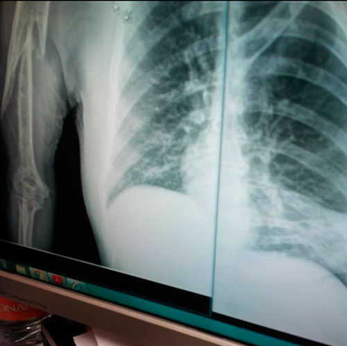 Casi en forma milagrosa a los dos meses ya escribía en la computadora. El nervio radial se recuperó; sin embargo el húmero se divide en tres partes, la proximal, cercana al hombro; la distal pegada al codo y la diáfisis, que se encuentra a la mitad. Esta se separó.