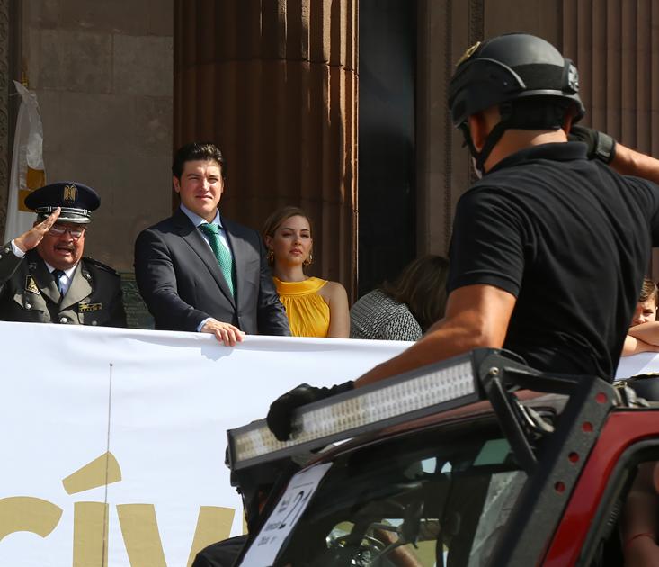 Luego de dar lectura al Acta de Independencia del 28 de septiembre de 1821, Samuel García, en su primer desfile de Independencia como Gobernador, atestiguó el paso de 32 contingentes conformados por más de 3 mil 422 personas, 26 bandas de guerra, 35 escoltas, 36 motociclistas y 43 elementos caninos, utilizando 4 plataformas, 17 bicicletas, 39 vehículos ligeros, 156 vehículos pesados y 64 caballos.