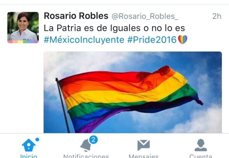 CIUDAD DE MÉXICO, 26 de junio (Al Momento Noticias).- Tras la realización de la Marcha por el Orgullo Gay 2016, en la que participaron más de 800 mil personas, la titular de la Secretaría de Desarrollo Agrario, Territorial y Urbano (SEDATU), Rosario Robles manifestó vía Twitter su felicitación a la comunidad LGBTTTI.