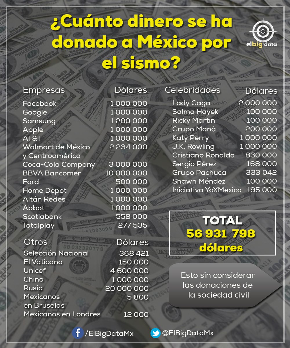 Una actualización publicada por BIG DATA y que se multiplicó en las redes sociales tras la mediación de Víctor Trujillo en su personaje de Brozo: aumentó a casi 57 millones de dólares la cantidad de donaciones para ayudar a las VÍCTIMAS de los terremotos de septiembre de 2017. Esto significa 21 millones de dólares más de lo que publicamos en la página anterior de este diario y equivale a 1026 millones de pesos.