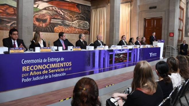 Durante la entrega de reconocimientos por antigüedad a servidores públicos de la SCJN, acompañaron al Presidente del Alto Tribunal, las Ministras Norma Lucía Piña Hernández y Yasmín Esquivel Mossa, así como los Ministros Juan Luis González Alcántara Carrancá, Javier Laynez Potisek. José Fernando Franco González Salas, Luis María Aguilar Morales, Jorge Mario Pardo Rebolledo y Alberto Pérez Dayán.