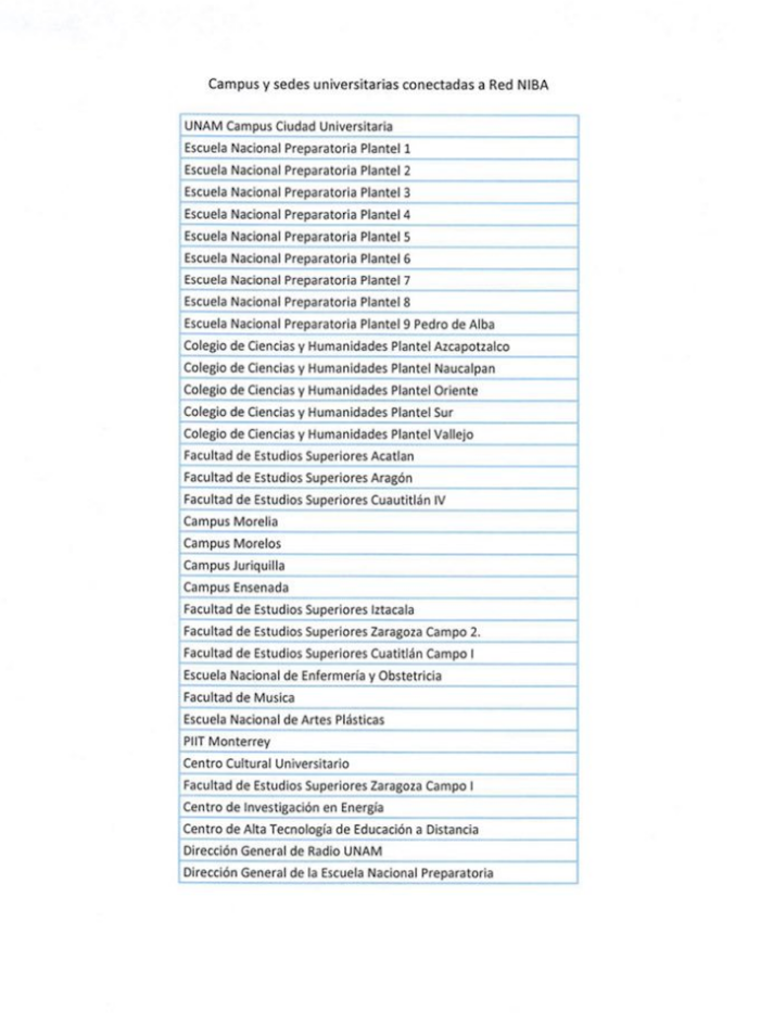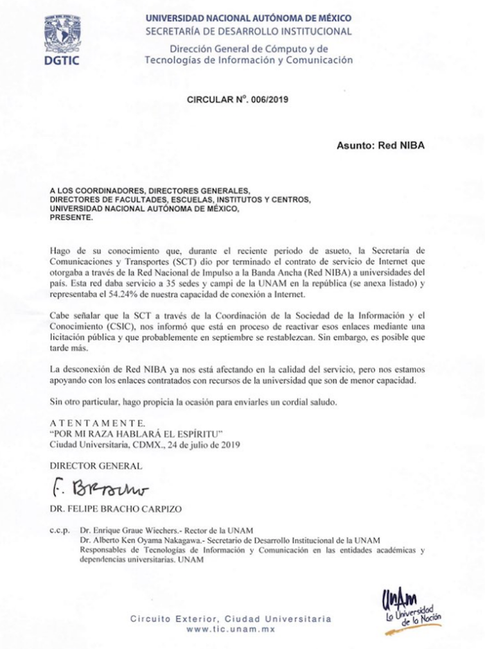 A través de su cuenta de una circular de la Dirección General de Cómputo y de Tecnologías de Información y Comunicación (DGTIC), la UNAM informó que en el pasado periodo de asueto “la SCT dio por terminado el contrato de servicio de internet que otorgaba a través de la Red Nacional de Impulso a la Banda Ancha (Red NIBA) a universidades del país”.
