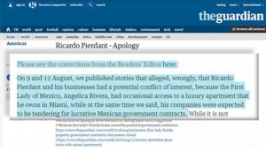 En un artículo, el diario admitió que publicó información falsa sobre el empresario Ricardo Pierdant, “aceptamos que ninguna de las sociedades del señor Pierdant ha obtenido ningún contrato con el Gobierno mexicano ni han participado en cualquiera de dichos procesos de contratación”.