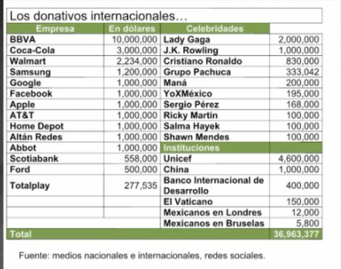 …y ya ni mencionar las donaciones de BBVA, Walmart, Samsung, Apple, Home Depot, Scotia Bank, Unicef, BID, y una lista interminable de estrellas del espectáculo internacional que juntas hacen un monto que multiplica las cifras que quiere ajustar el gobiernito de Atracomulco, para darnos una estocada mortal.