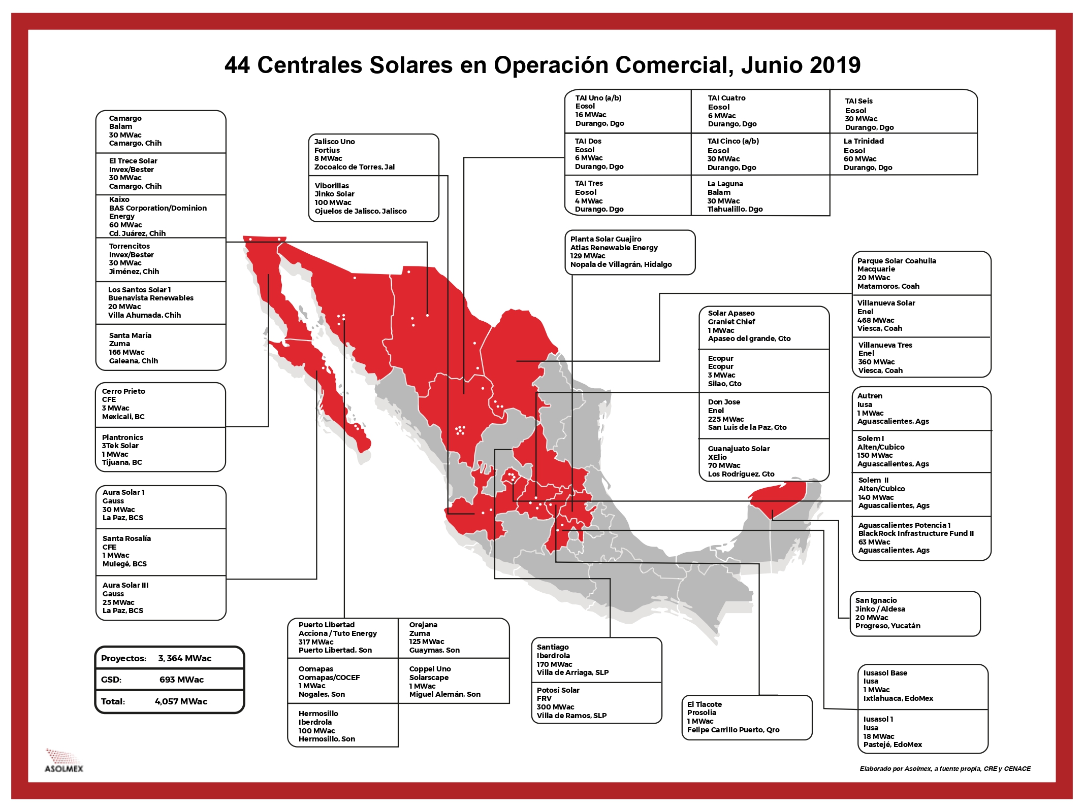 Apenas en diciembre de 2018, el país contaba con 38 centrales solares en operación comercial, ubicadas estratégicamente en once estados. Hoy, 44 parques solares en 14 entidades federativas están en operación comercial, con una capacidad instalada de 3,364 MW, lo que representa un crecimiento de 34% en generación solar a gran escala.