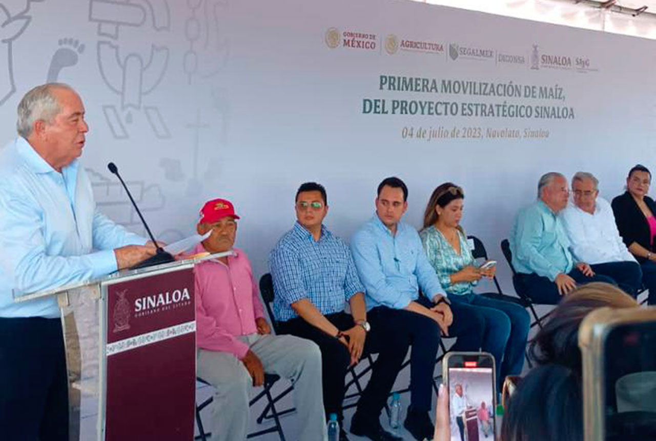 Acompañado del Gobernador de Sinaloa, Rubén Rocha, informó que con el Programa de Adquisición de Maíz en Sinaloa, con el que se cumple el compromiso del Presidente López Obrador de apoyar a pequeños productores de maíz, y con el que se tiene contemplado realizar la compra de 2 millones de toneladas, se lleva a la fecha un 30 por ciento de avance, con 3 mil 535 productores beneficiados hasta el día de hoy, lo que representa una derrama económica de poco más de 2 mil millones de pesos y un acopio documentado del maíz de 299 mil 715.33 toneladas.