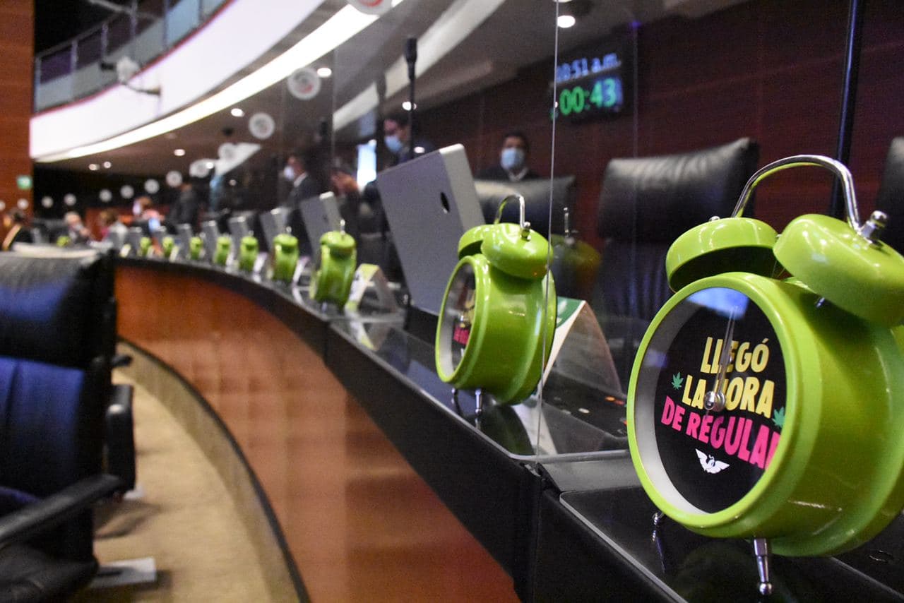 ​En medio de la discusión del dictamen, senadores de Movimiento Ciudadano colocaron en cada uno de los escaños relojes en color verde con la leyenda: “Llego la hora de regular”. En los escaños de la bancada de Morena y sus aliados, así como del PRD, también sobresalían carteles en colores verde y blanco donde se leía: “No a la criminalización. Sí a la libertad”.