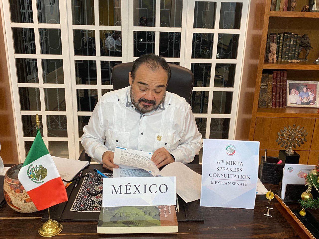 CIUDAD DE MÉXICO.- El vicepresidente del Senado, Jorge Carlos Ramírez Marín, representó a México en la Sexta Conferencia de Presidentes de Parlamentos del foro MIKTA, conformado por Australia, Corea, Indonesia, Turquía y México, y en el que se intercambiaron las estrategias y resultados que cada país ha obtenido en la contención de la pandemia por Covid-19.