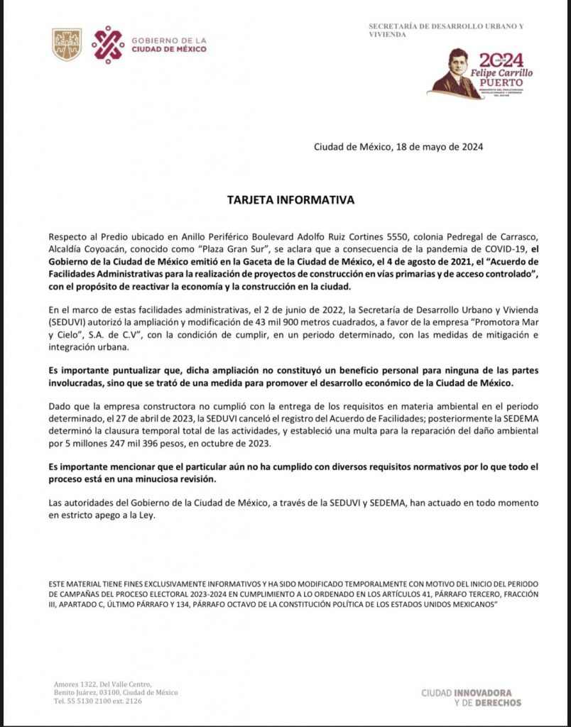 Según una tarjeta informativa publicada en redes sociales, el gobierno capitalino ratificó la información difundida por Latinus en el programa de Carlos Loret de Mola el pasado 17 de mayo. En este reportaje, se reveló que Promotora Mar y Cielo, la empresa detrás de Gran Sur, aprovechó un acuerdo publicado un año antes por la administración de Sheinbaum para solicitar la expansión del centro comercial.