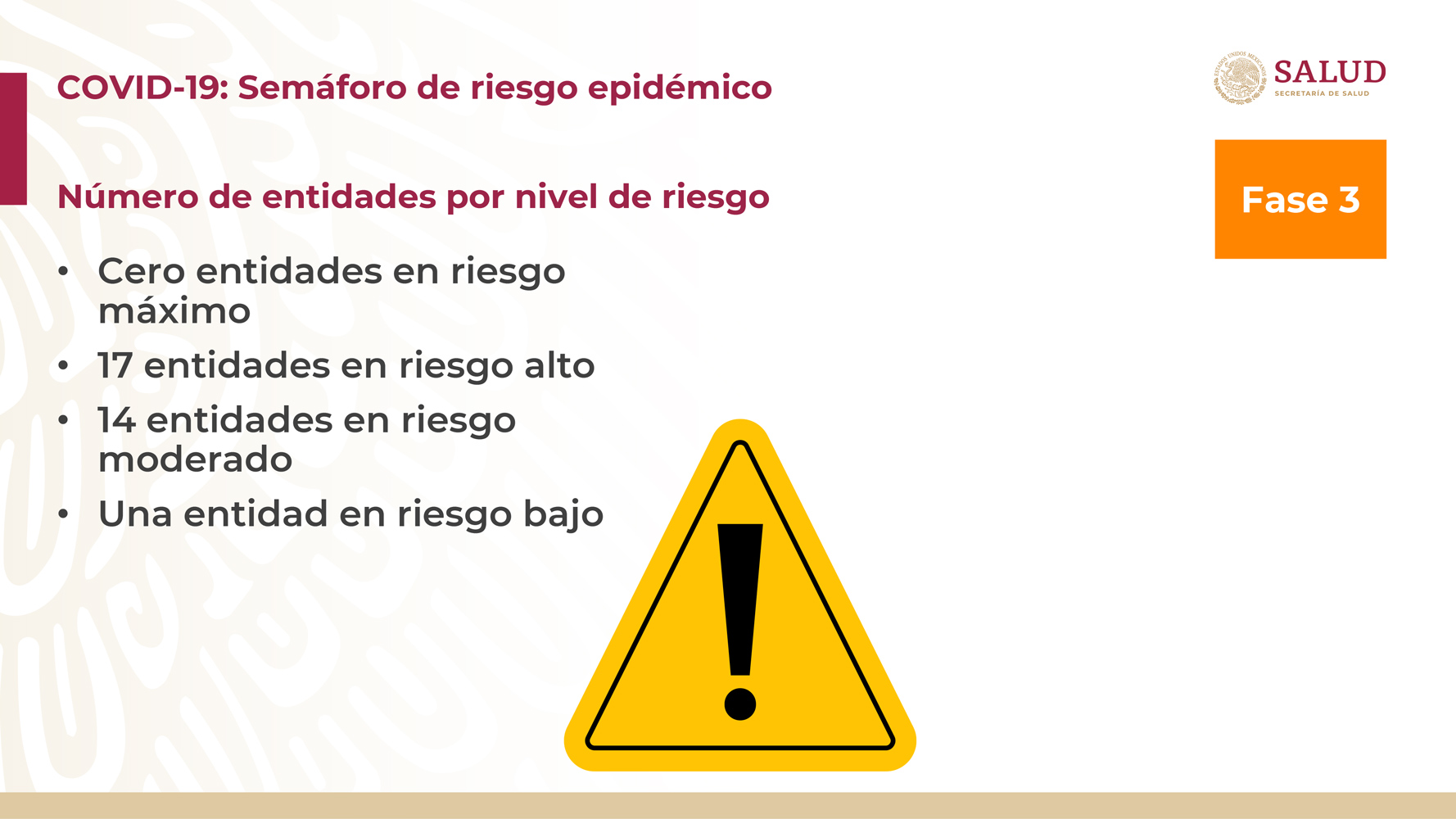 Mientras tanto, el subsecretario de Prevención y Promoción de la Salud, Hugo López-Gatell, advirtió que no hay que confiarse y que los avances epidemiológicos dependen del comportamiento y de la responsabilidad social.