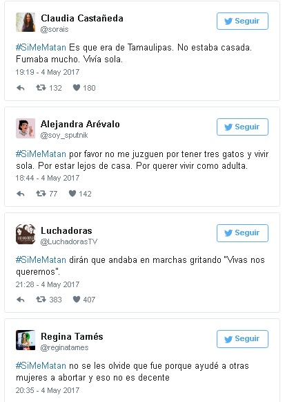 “#SiMeMatan sepan que no tengo padre, no tengo esposo y no tengo hijos; es decir, no soy hija, no soy esposa, no soy madre. Sólo soy mujer”, decía otro mensaje.