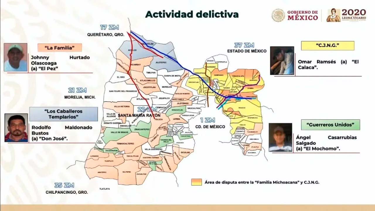 El titular de la Secretaría de Defensa Nacional, el general Luis Cresencio Sandoval, mencionó a cuatro grupos que operan en el Estado de México: La Familia Michoacana, Cártel Jalisco Nueva Generación, Los Caballeros Templarios y Guerreros Unidos.