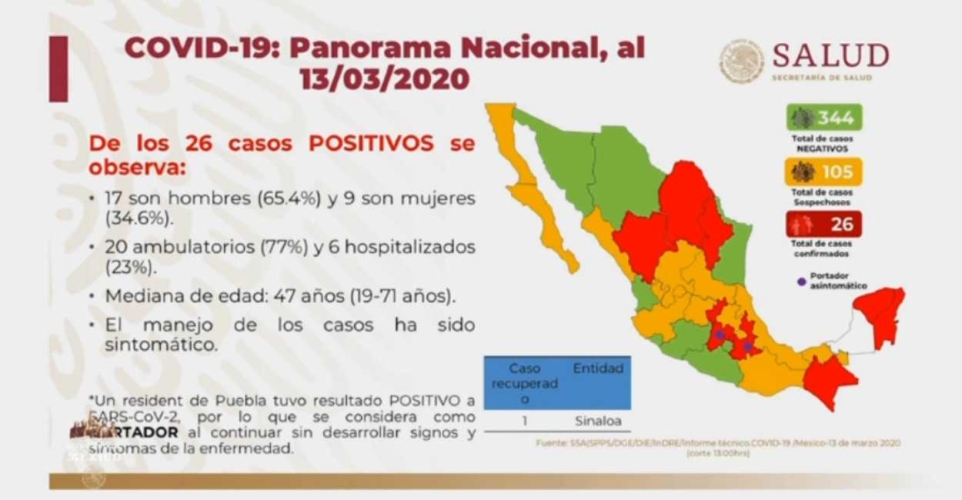 En conferencia de prensa, la Secretaría de Salud confirmó, que suman ya 26 los casos de infectados con el Covid-19.
