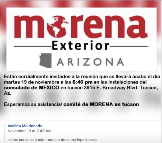 Pese a que la Ley del Servicio Exterior Mexicano prohíbe y sanciona el uso partidista de las sedes diplomáticas, el nuevo Cónsul de Tucson, dirigente de Morena en Nogales, presidió una reunión en la sala de juntas del Consulado, convocada por Morena y asistida por militantes de ese partido. “Las redes se mueven por sí solas… cualquier persona que quiera hacer un anuncio de esa índole pues nosotros no somos ninguna autoridad para poder impedirles. No tenemos el control de las redes sociales externas”.