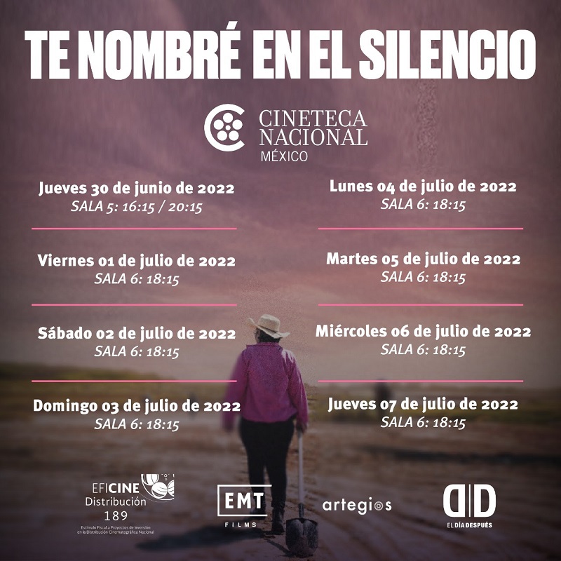 Luego de una prolífica gira por festivales, que incluye al Festival de cine documental DocsMX, (2021), Ambulante gira de documentales (2021), Festival Internacional de Cine Documental Zanate (Colima, 2021) o el Ciclo Internacional sobre Justicia Transicional y Paz (México, España, Colombia), entre otros, Te nombré en el silencio se presenta en la Cineteca Nacional de México a partir de hoy 30 de junio al 7 de julio en diversos horarios.