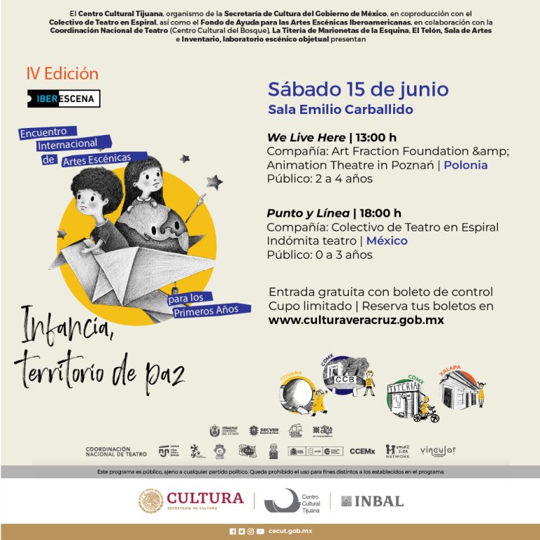 Xalapa.- El sábado 15 de junio en esta ciudad a las 13:00 horas se contará con la participación de la compañía de teatro «Art Fraction Foundation & Animation Theatre in Poznań», de Polonia, con la obra We live here, dirigida a un público de 2 a 4 años. Posteriormente, en punto de las 18:00 horas, el Colectivo de Teatro en Espiral y la compañía Indómita compartirán la producción Punto y línea, destinada a un público de 0 a 3 años.